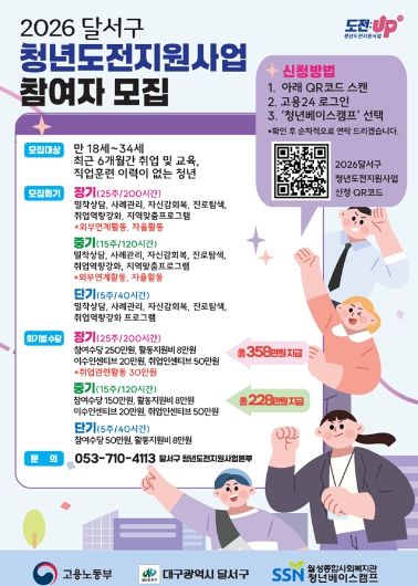 (포탈뉴스통신) 대구 달서구는 청년들의 자신감 회복과 취업 의지 제고를 위해 ‘청년도전지원사업’을 6년 연속 추진하며, 올해도 참여자를 모집하고 있다.