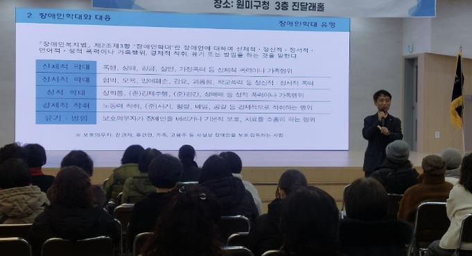 이날 교육은 곽병권 부천시장애인인권센터장이 강사로 나서 장애와 인권, 장애인 학대 및 대응 방법, 장애 유형별 소통과 지원, 인권센터 대응 사례, 활동지원사 신고 사례 등을 중심으로 진행됐다.