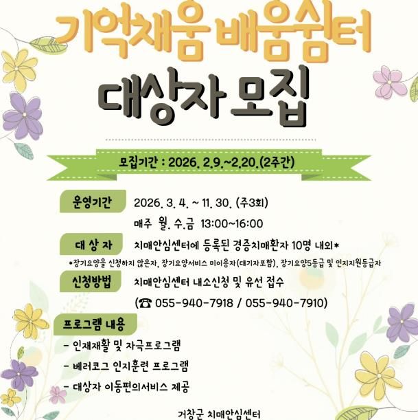 (포탈뉴스통신) 거창군치매안심센터는 오는 9일부터 20일까지 경증 치매 환자 중 전문적 인지자극 프로그램과 돌봄을 제공하는 ‘기억채움 배움쉼터’에 참여할 대상자를 모집한다.