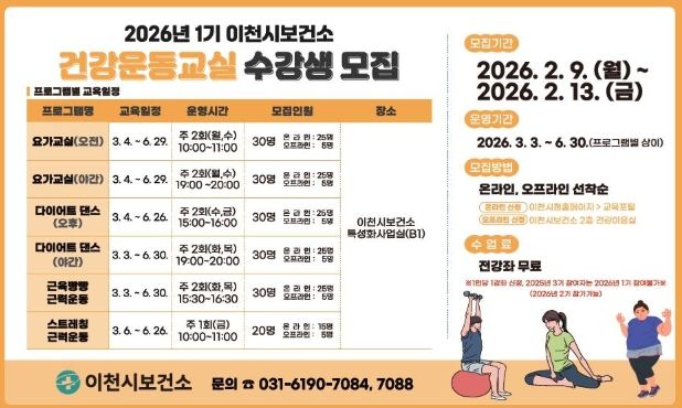(포탈뉴스통신) 이천시보건소는 시민들이 건강생활을 실천할 수 있도록 ‘2026년 건강운동교실 1기’ 참여자를 선착순으로 모집한다.