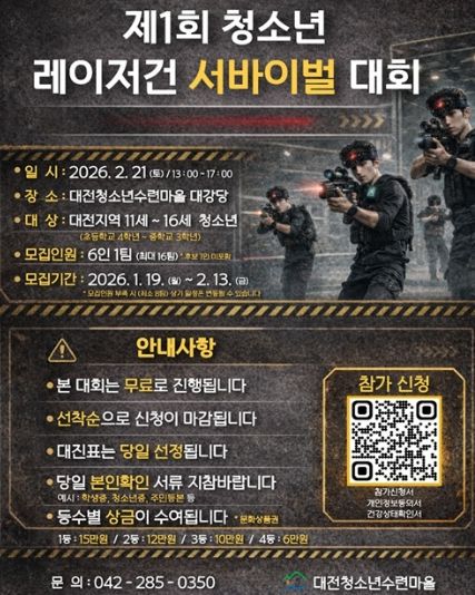 (포탈뉴스통신) 대전청소년수련마을은 지역 청소년의 건강한 여가문화 조성과 협동심 함양을 위해 ‘제1회 레이저건 서바이벌 대회’를 21일 개최한다.
