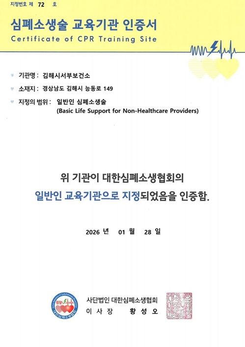 (포탈뉴스통신) 김해시는 김해시서부보건소가 대한심폐소생협회(KACPR)로부터 ‘일반인 심폐소생술 교육기관(TS)’으로 공식 지정됐다고 6일 밝혔다.