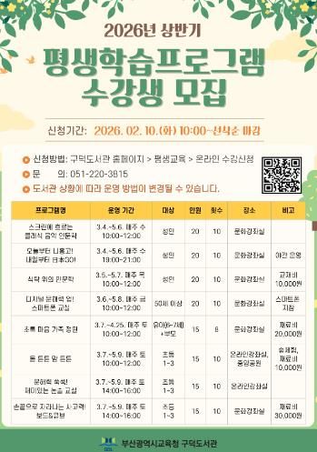 (포탈뉴스통신) 부산광역시립구덕도서관은 3월부터 5월까지 유아와 성인 140여 명을 대상으로 구덕도서관에서 ‘2026년 상반기 평생학습 프로그램’을 운영한다.