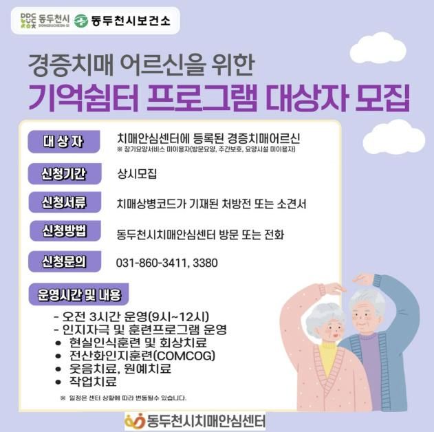 (포탈뉴스통신) 동두천시치매안심센터는 경증 치매 환자를 대상으로 ‘기억쉼터 프로그램’ 1기 참여자를 모집한다고 밝혔다. 프로그램은 2026년 3월 9일부터 5월 12일까지 운영된다.