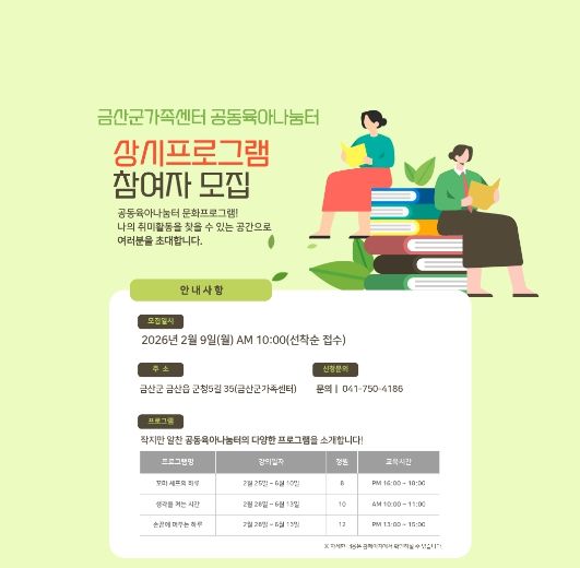 (포탈뉴스통신) 금산군가족센터는 영유아 및 초등 자녀를 둔 가정은 물론 지역 내 성인을 대상으로 2026년 상반기 공동육아나눔터 상시프로그램 참여자를 2월 9일 오전 10시부터 선착순 모집한다.