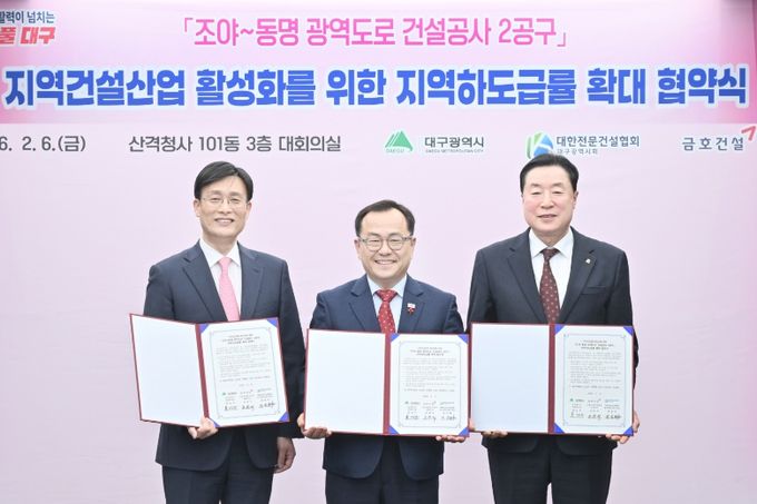 (포탈뉴스통신) 대구광역시는 2월 6일오후 2시 시청 산격청사에서 ‘조야~동명 광역도로건설 2공구’ 공사에 수반되는 하도급의 지역업체 참여 비율 확대를 위해 금호건설㈜, 대한전문건설협회 대구시회와 3자 협약을 체결했다.