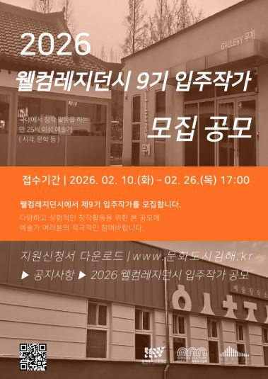 (포탈뉴스통신) (재)김해문화관광재단(대표이사 최석철) 김해문화도시센터는 오는 10일부터 26일까지‘2026 웰컴레지던시 제9기 입주작가’를 모집한다.