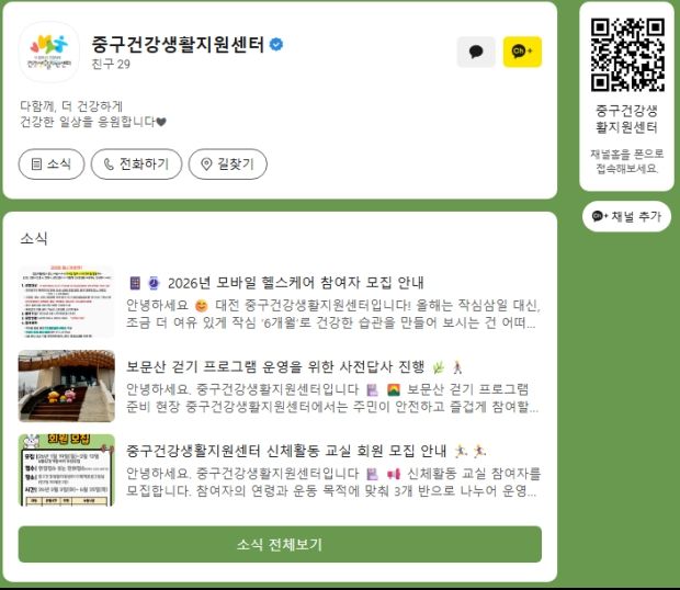 (포탈뉴스통신) 대전 중구는 주민들에게 보다 폭넓고 신속한 건강 정보와 중구건강생활지원센터에서 추진하는 각종 사업 정보를 제공하기 위해 카카오톡 채널을 개설・운영한다고 8일 밝혔다.