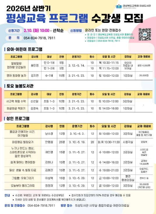 (포탈뉴스통신) 경상북도교육청 의성도서관은 지역주민의 평생학습 기회를 확대하고 삶의 질 향상을 도모하기 위해 2월 10일(화)부터 상반기 평생교육 프로그램 수강생을 모집한다고 밝혔다.