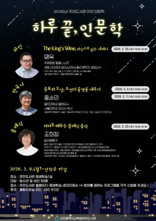(포탈뉴스통신) 인천광역시교육청주안도서관은 2월부터 3월까지 시민들이 다양한 인문학 주제를 접할 수 있는 야간 인문학 프로그램 ‘하루 끝, 인문학’을 운영한다.