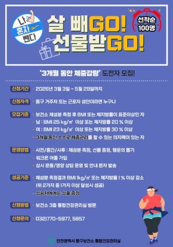 (포탈뉴스통신) 인천 동구보건소는 주민 스스로 건강한 체중 관리를 할 수 있도록 돕는‘나 혼자 뺀다! 살빼GO! 선물받GO!’프로그램 참여자를 모집한다고 밝혔다.