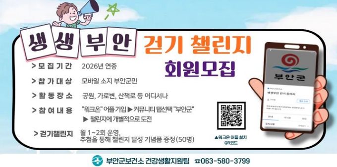 (포탈뉴스통신) 부안군보건소는 군민의 일상 속 걷기 실천을 활성화하고 건강생활실천 문화를 확산하기 위해 시공간의 제약 없이 스마트폰으로 누구나 쉽게 참여할 수 있는 모바일 걷기 앱 ‘워크온(WalkOn)’을 활용한 생생부안 걷기 챌린지 회원을 매월 모집한다고 밝혔다.