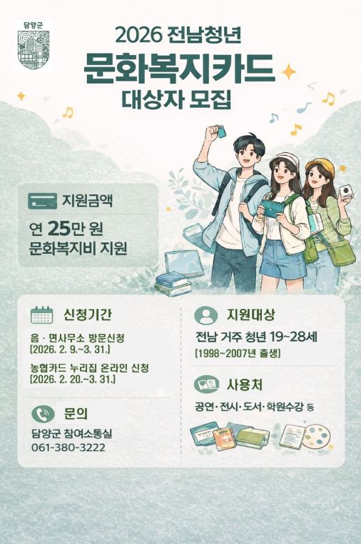 군 관계자는 “전남청년 문화복지카드 지원사업을 통해 청년들의 문화 참여 기회를 넓히고 삶의 질을 높이는 계기가 되길 바란다”라며 “앞으로도 청년의 수요를 반영한 문화·복지 정책을 추진해 청년이 머물고 성장할 수 있는 담양을 만들어 가겠다”라고 말했다.