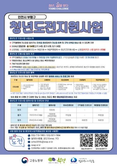(포탈뉴스통신) 부평구는 오는 10월까지 구직에 어려움을 겪고 있는 지역 청년들의 사회 재진입을 돕기 위한 ‘2026년 청년도전지원사업’ 참여자를 모집한다고 밝혔다.