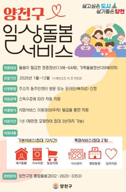 (포탈뉴스통신) 양천구는 일상생활에 어려움을 겪는 청·중장년과 가족돌봄청년을 더욱 두텁게 지원하기 위해 2026년부터 ‘일상돌봄 서비스’를 확대 시행한다고 10일 밝혔다.