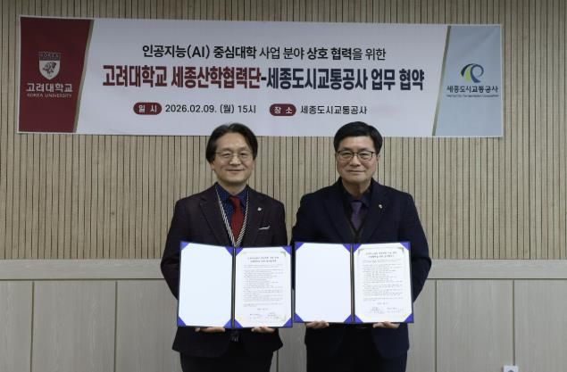 (포탈뉴스통신) 세종도시교통공사는 2월 9일, 공사 사장실에서 고려대학교 세종산학협력단과 ‘인공지능(AI) 중심대학 사업 협력 및 공사 사업 AX(AI 전환) 가속화를 위한 업무협약(MOU)’을 체결했다고 밝혔다.