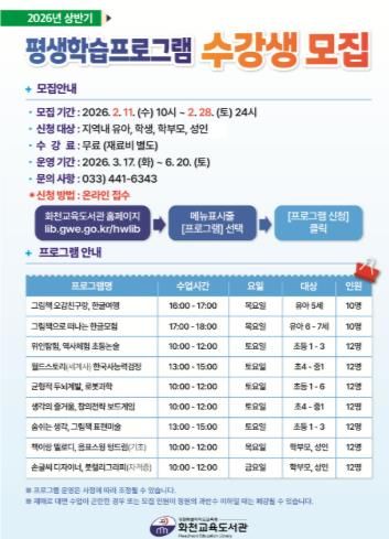 수강생 모집 기간은 2월 11일부터 2월 28일까지이며, 화천교육도서관 누리집을 통해 선착순으로 접수한다.