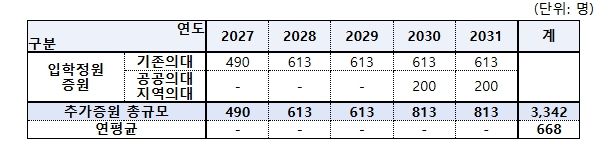 (포탈뉴스통신) 보건복지부는 2월 10일 오후 2시, 정부서울청사(서울 종로구 소재)에서 제7차'보건의료정책심의위원회'(이하 보정심)를 개최하여 지역․필수․공공의료 강화를 위해 서울을 제외한 32개 의과대학을 대상으로 2027년부터 2031년까지 의사인력 양성 규모를 연평균 668명 늘리기로 결정했다. 기존 의대 증원 인원 중 2024학년도 정원(3,058명)을 초과하는 부분은 모두 지역의사로 선발된다. 또한 증원 초기 의학교육 현장의 부담을 완화하기 위하여 단계적으로 증원을 추진한다.