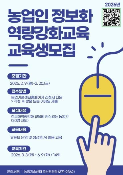 (포탈뉴스통신) 음성군농업기술센터는 농업인의 디지털 활용 능력과 온라인 홍보 역량 강화를 위해 ‘2026년 농업인 정보화 역량강화교육’ 교육생을 모집한다.