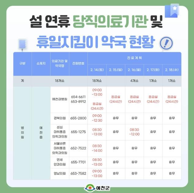 (포탈뉴스통신) 예천군은 설 연휴 동안 관내 병․의원 당직의료기관과 휴일 지킴이 약국을 운영해 진료 편의와 응급진료 서비스를 제공한다.