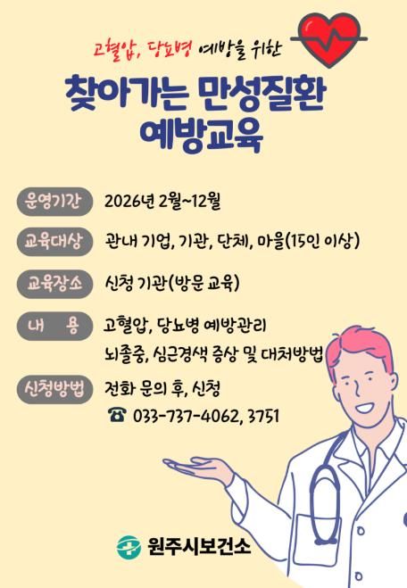 (포탈뉴스통신) 원주시보건소는 2월부터 12월까지 지역 주민을 대상으로 고혈압·당뇨병 등 만성질환 예방교육을 운영한다.