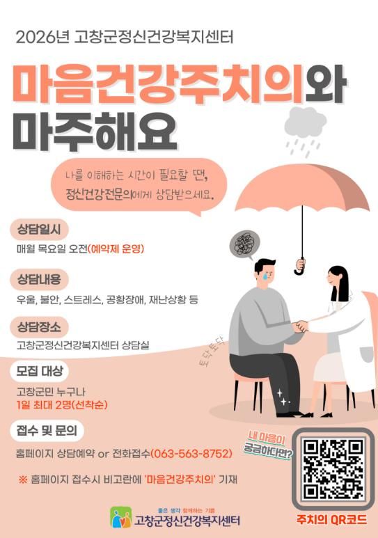 (포탈뉴스통신) 고창군 정신건강복지센터가 지역주민의 마음 건강 증진을 위해 2026년 마음건강주치의 사업을 운영하고 있다.