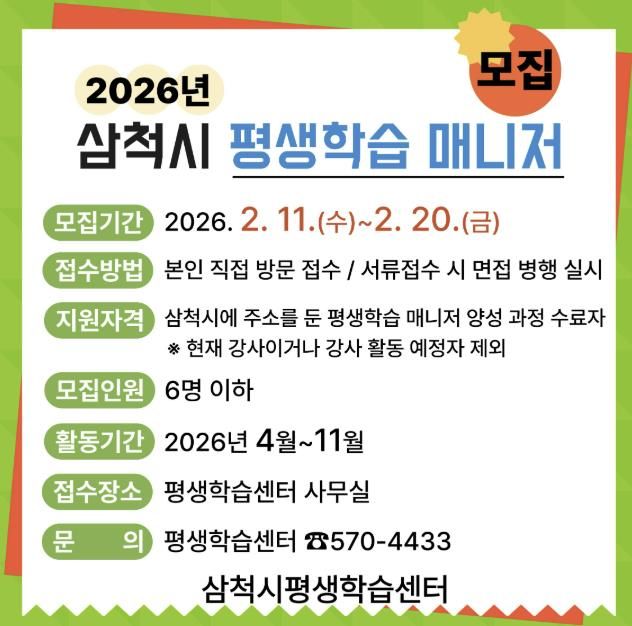(포탈뉴스통신) 삼척시는 2월 11일부터 20일까지 평생학습 매니저 양성과정 수료자를 대상으로 2026년 삼척시 평생학습 매니저를 모집한다고 밝혔다.