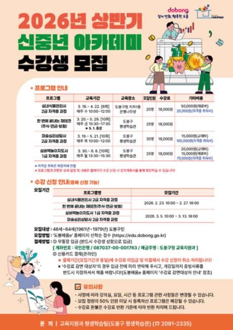 (포탈뉴스통신) 서울 도봉구가 2026년 상반기 신중년 아카데미 수강생을 모집한다. 이번 상반기는 신중년들이 제2의 인생을 준비할 수 있는 인생재설계 과정과 직업 역량 강화를 위한 강의로 구성된다.