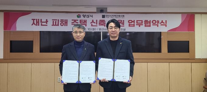 (포탈뉴스통신) 양산시는 지난 10일 시청 소회의실에서 양산시지역건축사회와 함께 '재난피해주택 신축 지원을 위한 업무협약'을 체결했다.