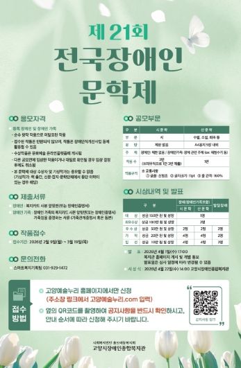 (포탈뉴스통신) 고양시장애인종합복지관은 3월 19일까지 전국의 장애인 및 장애인 가족을 대상으로 ‘제21회 전국장애인문학제’ 작품 접수를 진행한다.