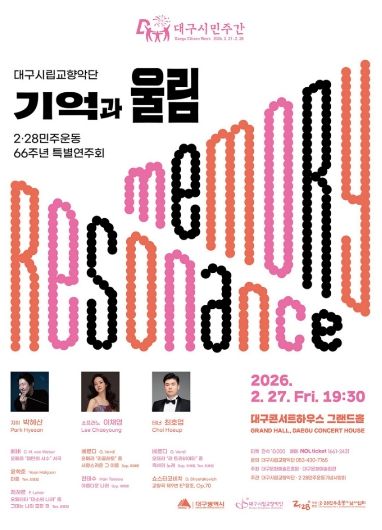 (포탈뉴스통신) 대구시립교향악단은 대구시민주간과 2·28민주운동 66주년을 맞아 2.28민주운동기념사업회와 함께하는 특별연주회 '기억과 울림'을 오는 2월 27일 오후 7시 30분, 대구콘서트하우스 그랜드홀에서 개최한다.
