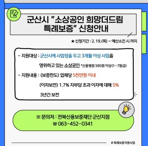 지원을 원하는 소상공인은 전북신용보증재단 군산지점에 신청해 보증서를 발급받아 관내 금융기관(농협·전북은행·신한은행·우리은행·하나은행)에서 융자받으면 된다.