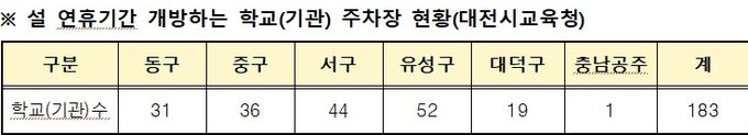 (포탈뉴스통신) 대전시교육청은 설 연휴 기간인 2월 14일부터 18일까지 대전을 찾는 귀성객과 지역 주민의 주차 편의를 위해 관내 각급 학교와 교육청, 산하기관 등 총 183곳의 주차장을 무료로 개방한다고 밝혔다.