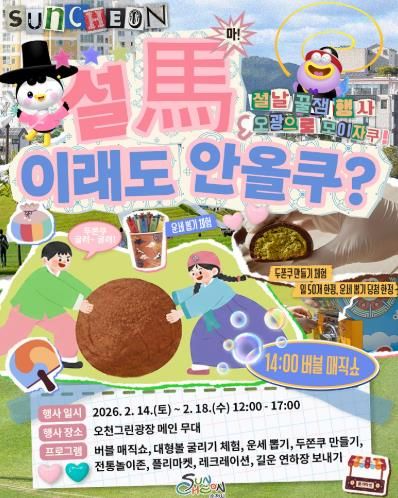 (포탈뉴스통신) 순천시는 설 명절 기간 시민과 귀성객이 함께 즐길 수 있는 참여형 문화 프로그램 '설馬, 이래도 안올쿠?'를 오는 14일부터 18일까지 오천그린광장에서 운영한다.