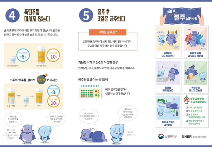 절주 실천수칙은 △술자리는 되도록 피하기 △남에게 술 강요하지 않기 △원샷 하지 않기 △폭탄주 마시지 않기 △음주 후 3일 이상 금주하기 등이며, 일상 속 실천을 통해 명절 기간 술 대신 덕담을 나누는 건강한 명절 분위기 확산이 기대된다.