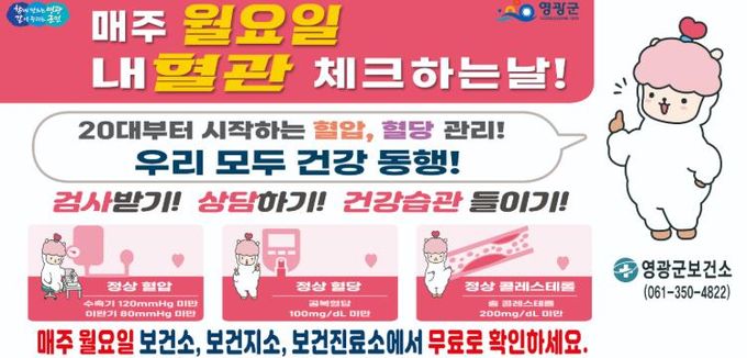 (포탈뉴스통신) 영광군은 심뇌혈관질환 예방을 위해 매주 월요일을‘혈관 건강 체크하는 날’로 지정해 오는 2월 23일부터 본격 추진한다고 밝혔다.