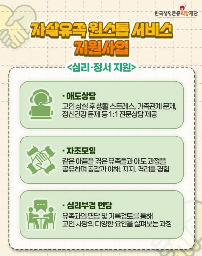 아울러, 자살 유족들이 마음을 터놓고 회복할 수 있는 시간을 가질 수 있도록 유족 자조모임을 운영할 계획이다.