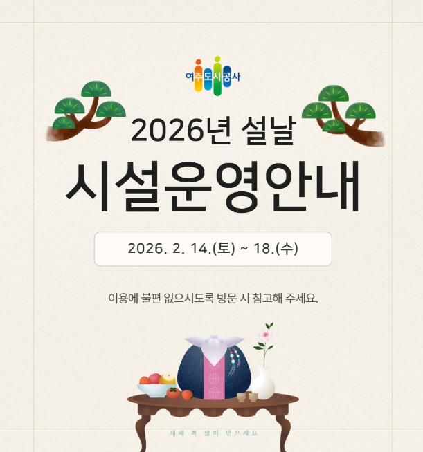 (포탈뉴스통신) 여주도시공사가 다가오는 2026년 설 연휴를 맞아 시민과 귀성객들이 안전하고 편안한 명절을 보낼 수 있도록 주요 시설 운영시간 조정 및 특별 서비스를 시행한다고 밝혔다.