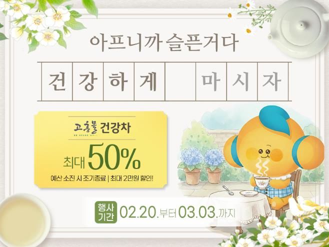 (포탈뉴스통신) 고흥군이 운영하는 온라인 농수축특산물 쇼핑몰 ‘고흥몰’은 환절기 건강 관리를 돕기 위한 ‘건강차 기획전’을 오는 2월 20일부터 3월 3일까지 진행한다고 밝혔다.