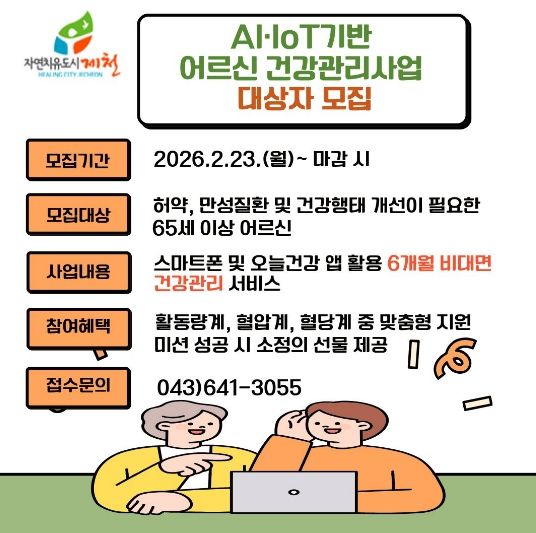 (포탈뉴스통신) 제천시보건소(소장 안순덕)는 인공지능(AI)과 사물인터넷(IoT) 기술을 활용해 어르신들의 만성질환을 체계적으로 관리하는‘AI·IoT 기반 어르신 건강관리사업’참여자를 오는 23일부터 모집한다.