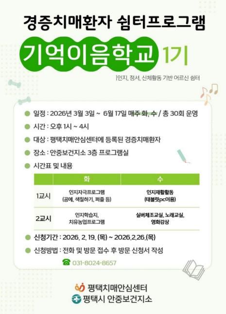 (포탈뉴스통신) 평택시 안중보건지소는 경증 치매 환자의 인지기능 유지와 일상생활 지원을 위해 오는 3월 3일부터 6월 17일까지 경증 치매 환자 쉼터 프로그램 ‘기억이음학교 1기’를 운영한다.