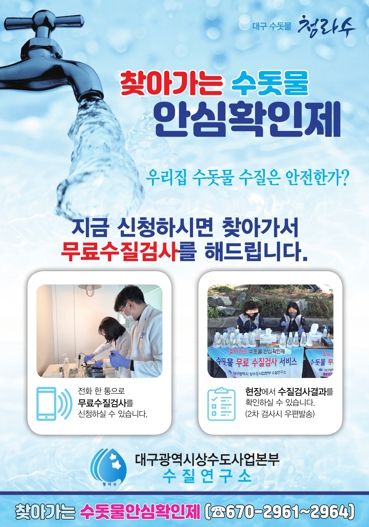 (포탈뉴스통신) 대구광역시 상수도사업본부는 3월 9일부터 11월까지 대구 수돗물‘청라수’의 수질이 궁금한 시민들을 대상으로 전문가가 직접 방문해 무료로 수질검사를 제공하는 ‘찾아가는 수돗물 안심확인제’를 운영한다.