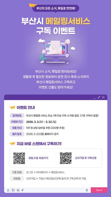 (포탈뉴스통신) 부산시는 시민들이 주요 시정 소식과 생활 정보를 보다 신속하고 편리하게 받아볼 수 있도록 오는 3월 3일부터 3월 22일까지 '부산시 소식, 메일로 한 번에(메일링 서비스 구독 이벤트)'를 추진한다고 밝혔다.