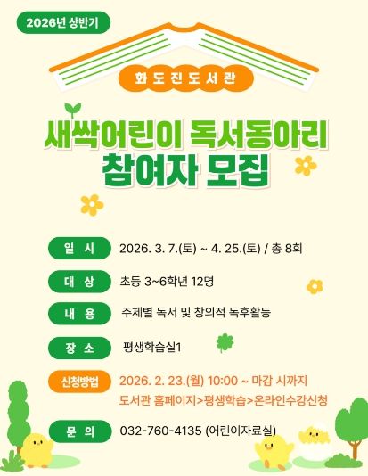 (포탈뉴스통신) 인천광역시교육청화도진도서관은 23일부터 초등 3~6학년 학생을 대상으로, 기초 문해력과 자기주도적 독서 습관 강화를 위한 ‘2026년 새싹어린이 독서동아리’ 참여자를 모집한다.
