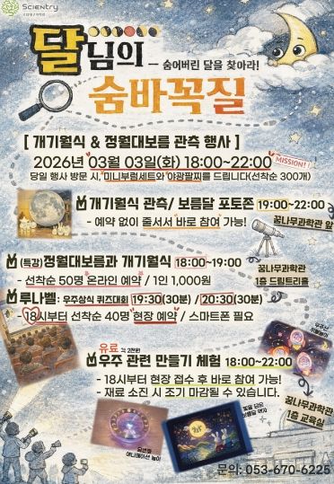 (포탈뉴스통신) 국립대구과학관은 개기월식과 정월대보름을 기념해 3월 3일 ‘개기월식·정월대보름 관측행사: 달님의 숨바꼭질’을 개최한다.
