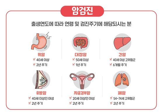 검진 대상과 주기는 ▲위암(40세 이상, 2년 주기) ▲대장암(50세 이상, 매년) ▲간암(40세 이상 고위험군, 6개월 주기) ▲유방암(40세 이상 여성, 2년 주기) ▲자궁경부암(20세 이상 여성, 2년 주기) ▲폐암(고위험군 대상) 등이다.