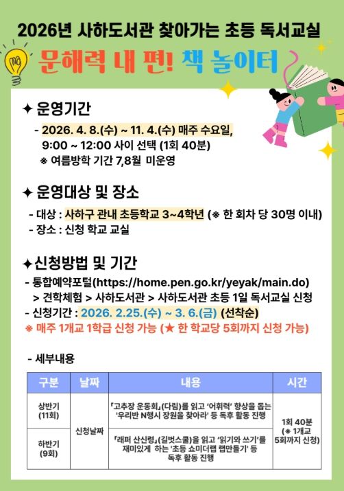(포탈뉴스통신) 부산시교육청 사하도서관은 4월부터 11월까지(7, 8월 제외) 사하구 관내 초등학교에서 3~4학년 학생을 대상으로 2026년 찾아가는 초등 독서교실 ‘문해력 내 편! 책 놀이터’를 운영한다.