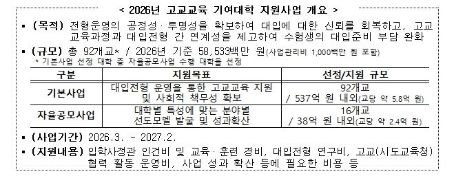 (포탈뉴스통신) 교육부은 2월 24일, ‘2026년 고교교육 기여대학 지원사업 기본계획’을 발표한다.