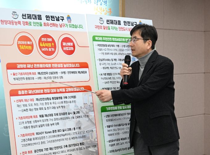 (포탈뉴스통신) 울산 남구는 24일 남구청 프레스센터에서 정례브리핑을 열고 재난의 대형화·복합화와 기후변화에 따른 자연재난 증가에 대응하기 위해 재난안전국 중심의 통합 안전관리 체계 구축과 재해예방 인프라 확충을 포함한 2026년 종합 재난안전 정책을 본격 추진한다고 밝혔다.