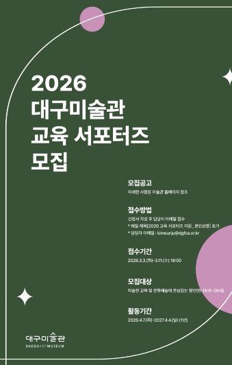 (포탈뉴스통신) 대구문화예술진흥원 대구미술관은 2026년 한 해 동안 지역 문화예술발전과 미술관 교육 현장을 함께 만들어 갈 문화자원봉사자 ‘교육 서포터즈’를 모집한다.